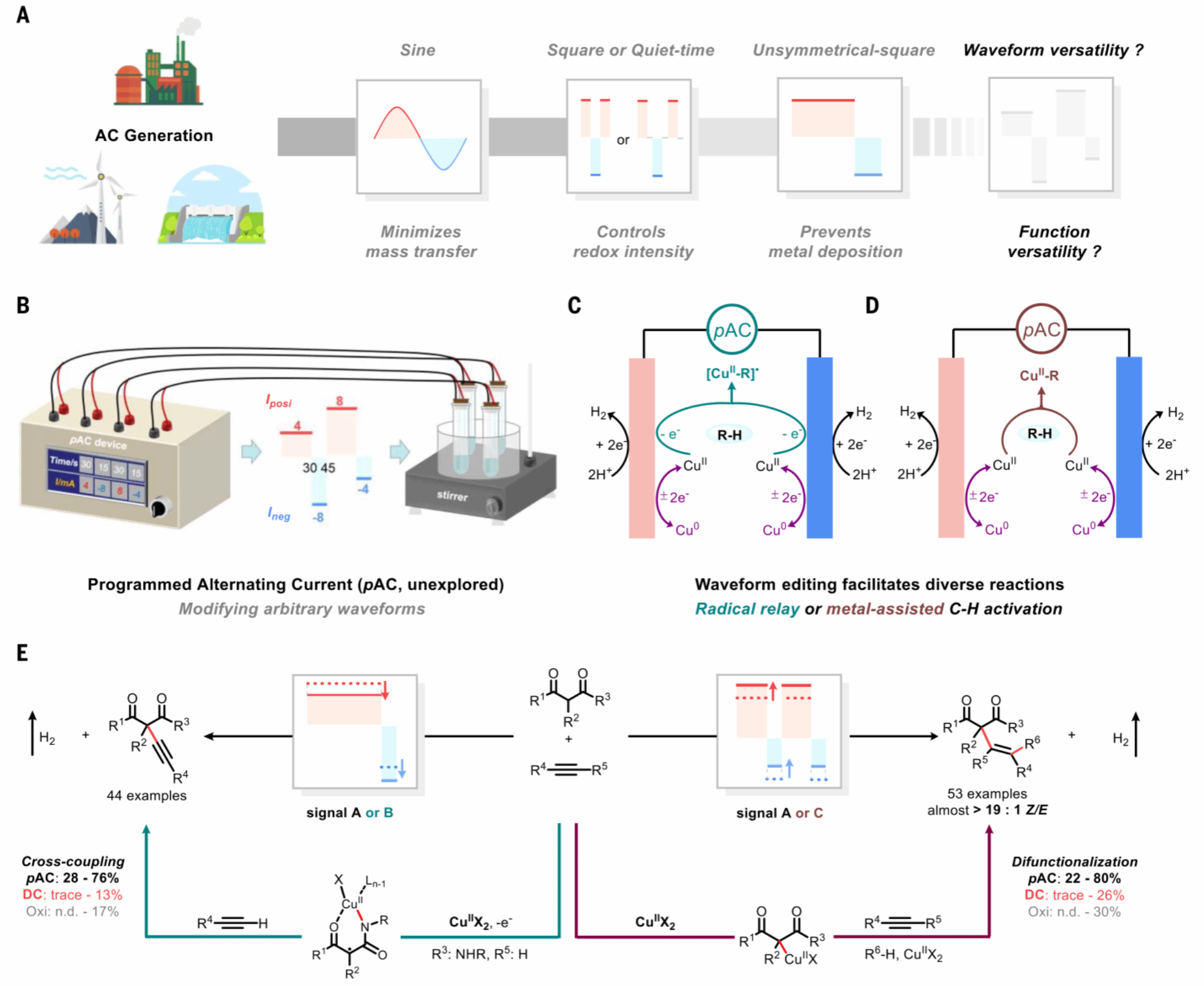 本項研究首創(chuàng)開發(fā)了可編程波形交流電(pAC)合成技術(shù),實現(xiàn)了銅催化的放氫氣氧化交叉偶聯(lián)反應(yīng)。通過對交流電波形的電學(xué)參數(shù)(頻率、電流和占空比)進(jìn)行程序編輯可得到定制化的交流電信號。不同編輯模式的電信號不僅促進(jìn)了電解條件下銅催化劑循環(huán)再生,而且分別精準(zhǔn)調(diào)控銅催化劑形成“銅結(jié)合碳自由基物種”和“碳-銅活性物種”。另外,雷愛文教授團(tuán)隊開發(fā)了原位電子順磁共振波譜-交流電解聯(lián)用表征技術(shù),首次觀測到不同交流電信號動態(tài)調(diào)控銅催化物種活性的變化規(guī)律。基于可編程交流電合成技術(shù),研究團(tuán)隊成功實現(xiàn)了銅催化活化烷烴直接碳?xì)滏I氧化偶聯(lián)反應(yīng)和氧化雙官能團(tuán)化反應(yīng),而這兩類反應(yīng)在傳統(tǒng)氧化劑條件和直流電氧化條件下均表現(xiàn)出較差的反應(yīng)性。