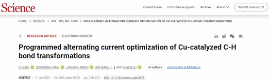 新聞通訊(通訊員曾力)北京時間7月12日,Science(《科學(xué)》雜志)在線發(fā)表了武漢大學(xué)高等研究院、化學(xué)與分子科學(xué)學(xué)院雷愛文教授團(tuán)隊關(guān)于交流電合成化學(xué)的最新研究論文,題為“Programmed alternating current optimization of Cu-catalyzed C-H bond transformations”(程序化交流電優(yōu)化銅催化C-H鍵轉(zhuǎn)化反應(yīng))。武漢大學(xué)高等研究院特聘副研究員曾力、化學(xué)與分子科學(xué)學(xué)院博士生楊慶紅、高等研究院碩士王建興為論文的共同第一作者,雷愛文教授為唯一通訊作者,武漢大學(xué)為第一署名單位。