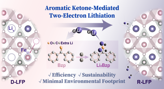 近年來(lái),錢江鋒課題組在化學(xué)鋰化反應(yīng)設(shè)計(jì)及應(yīng)用領(lǐng)域取得了一系列代表性成果(J. Am. Chem. Soc. 2025, 147, 29895; J. Am. Chem. Soc. 2025, 147, 21865; J. Am. Chem. Soc. 2024, 146, 6388; Adv. Energy Mater. 2024, 14, 2401197; ACS Sustainable Chem. Eng. 2021, 9, 16384)。在上述工作基礎(chǔ)上,該課題組將研究重點(diǎn)轉(zhuǎn)向低毒廉價(jià)試劑體系的開發(fā),通過(guò)分子結(jié)構(gòu)設(shè)計(jì)開發(fā)了以二苯甲酮鋰(Li2Bzp)為代表的“芳香酮介導(dǎo)雙電子轉(zhuǎn)移”新型鋰化體系,在室溫下僅需5分鐘即可完成對(duì)D-LFP的快速再生,使其電化學(xué)性能恢復(fù)至媲美商業(yè)材料的水平。該雙電子機(jī)制相較于傳統(tǒng)單電子體系,使所需試劑化學(xué)計(jì)量減半,顯著提升了經(jīng)濟(jì)可行性與環(huán)境可持續(xù)性。重要的是,使用后的試劑溶液(Bzp/THF)可實(shí)現(xiàn)高效循環(huán)利用,達(dá)到近100%原子經(jīng)濟(jì)性,從源頭減少?gòu)U棄物產(chǎn)生。該研究確立了一條快速、經(jīng)濟(jì)、綠色的閉環(huán)再生路徑,對(duì)推進(jìn)可持續(xù)電池回收技術(shù)具有重要潛力。