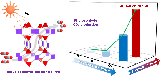 光催化CO2還原技術(shù)利用太陽(yáng)能將二氧化碳轉(zhuǎn)化為燃料和高附加值化學(xué)品,不僅是人工光合作用研究的核心內(nèi)容,也被認(rèn)為是實(shí)現(xiàn)碳中和目標(biāo)的重要途徑之一。然而,該技術(shù)目前仍面臨諸多挑戰(zhàn),亟需開發(fā)高效新型光催化劑。共價(jià)有機(jī)框架(COF)是一種新型晶態(tài)有機(jī)多孔材料,具有結(jié)構(gòu)可調(diào)、孔隙率高和穩(wěn)定性優(yōu)異等特點(diǎn),在光催化CO2還原領(lǐng)域展現(xiàn)出巨大潛力。其中,三維COF具有較高比表面積、貫通孔道結(jié)構(gòu)和豐富開放活性位點(diǎn),是進(jìn)一步提升光催化CO2還原性能并揭示構(gòu)效關(guān)系的理想模型催化劑。但由于三維COF合成和結(jié)構(gòu)表征面臨挑戰(zhàn),其孔道環(huán)境(如催化中心和孔徑)對(duì)光催化性能的影響,尚未有系統(tǒng)研究。